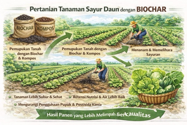 Biochar merupakan bahan organik kaya karbon yang dihasilkan dari proses pirolisis, yaitu pemanasan bahan biomassa seperti limbah pertanian, serasah tanaman, atau kayu pada suhu tinggi dengan minim oksigen. Produk ini memiliki sifat fisik, kimia, dan biologis yang unik, sehingga dapat dimanfaatkan sebagai pembenah tanah dalam pertanian. Khususnya pada budidaya sayuran daun—seperti selada, bayam, kangkung, dan sawi—biochar terbukti memberikan manfaat signifikan dalam meningkatkan kesuburan tanah, kesehatan tanaman, dan hasil panen secara berkelanjutan.
