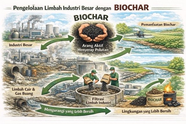 Pertumbuhan industri besar membawa dampak positif terhadap perekonomian, namun di sisi lain juga menghasilkan volume limbah yang signifikan, baik berupa limbah padat, cair, maupun gas. Limbah industri sering mengandung bahan berbahaya seperti logam berat, senyawa organik beracun, dan zat kimia persisten yang berpotensi mencemari lingkungan serta membahayakan kesehatan manusia. Oleh karena itu, diperlukan pendekatan pengelolaan limbah yang inovatif, berkelanjutan, dan ramah lingkungan. Salah satu solusi yang semakin banyak dikaji dan diterapkan adalah penggunaan biochar.