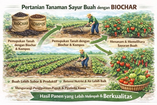 Biochar adalah bahan organik kaya karbon yang diperoleh melalui proses pirolisis, yaitu pemanasan bahan biomassa seperti limbah pertanian, serasah tanaman, atau kayu pada suhu tinggi dengan minim oksigen. Produk ini memiliki struktur berpori, stabil secara kimia, dan mampu menyerap air serta unsur hara secara efektif. Dalam pertanian, biochar telah dikenal sebagai pembenah tanah yang multifungsi, dan penerapannya pada budidaya sayuran buah—seperti tomat, cabai, dan terong—menunjukkan manfaat nyata bagi pertumbuhan tanaman, kualitas buah, dan produktivitas secara keseluruhan.